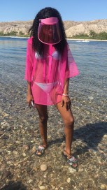Previous ImageNext Image img_0589 Pink Mesh Poncho: Forever 21 · Bikini · Slides: Aldo Floral Print Slippers · Visor: Forever 21